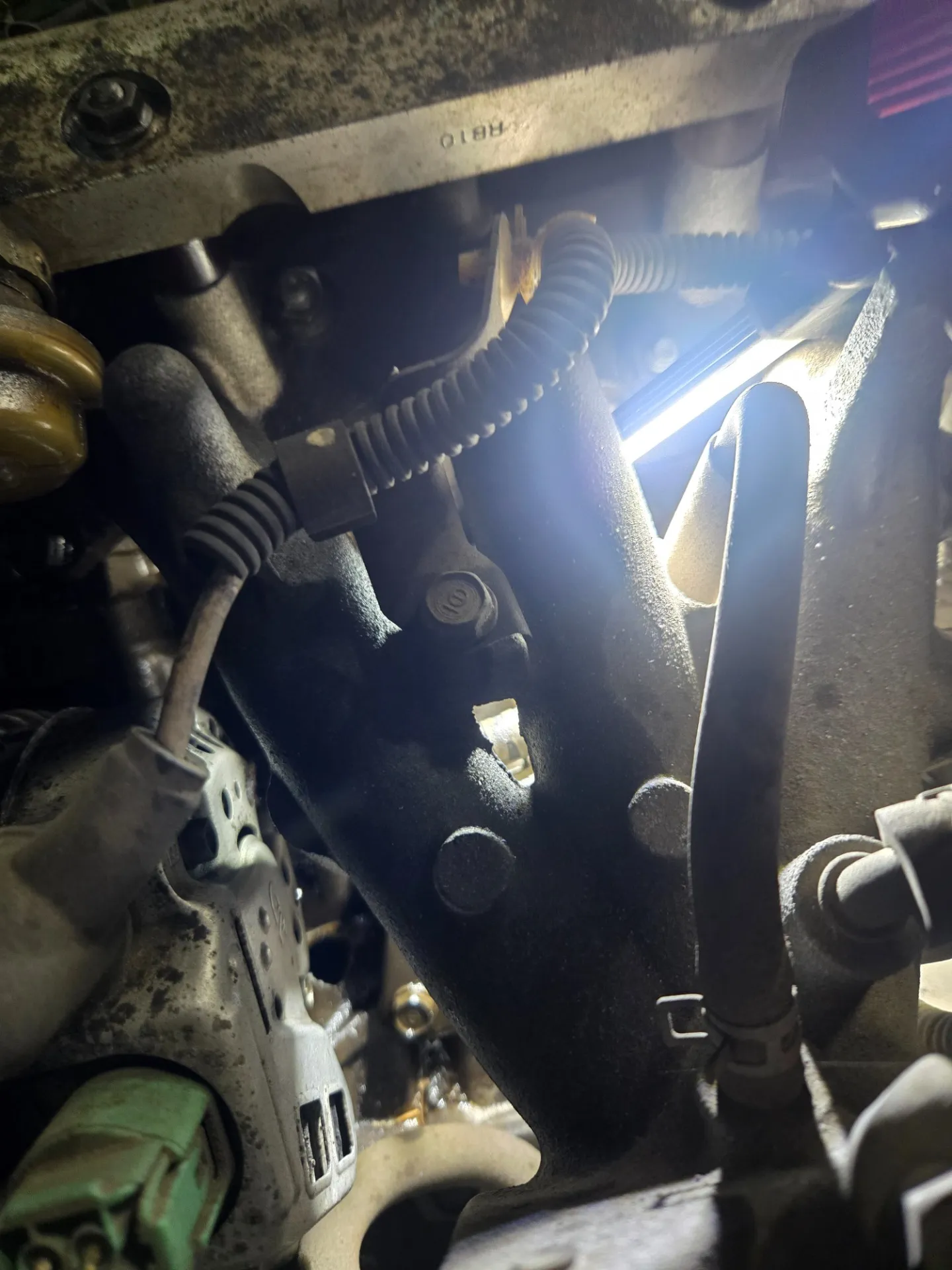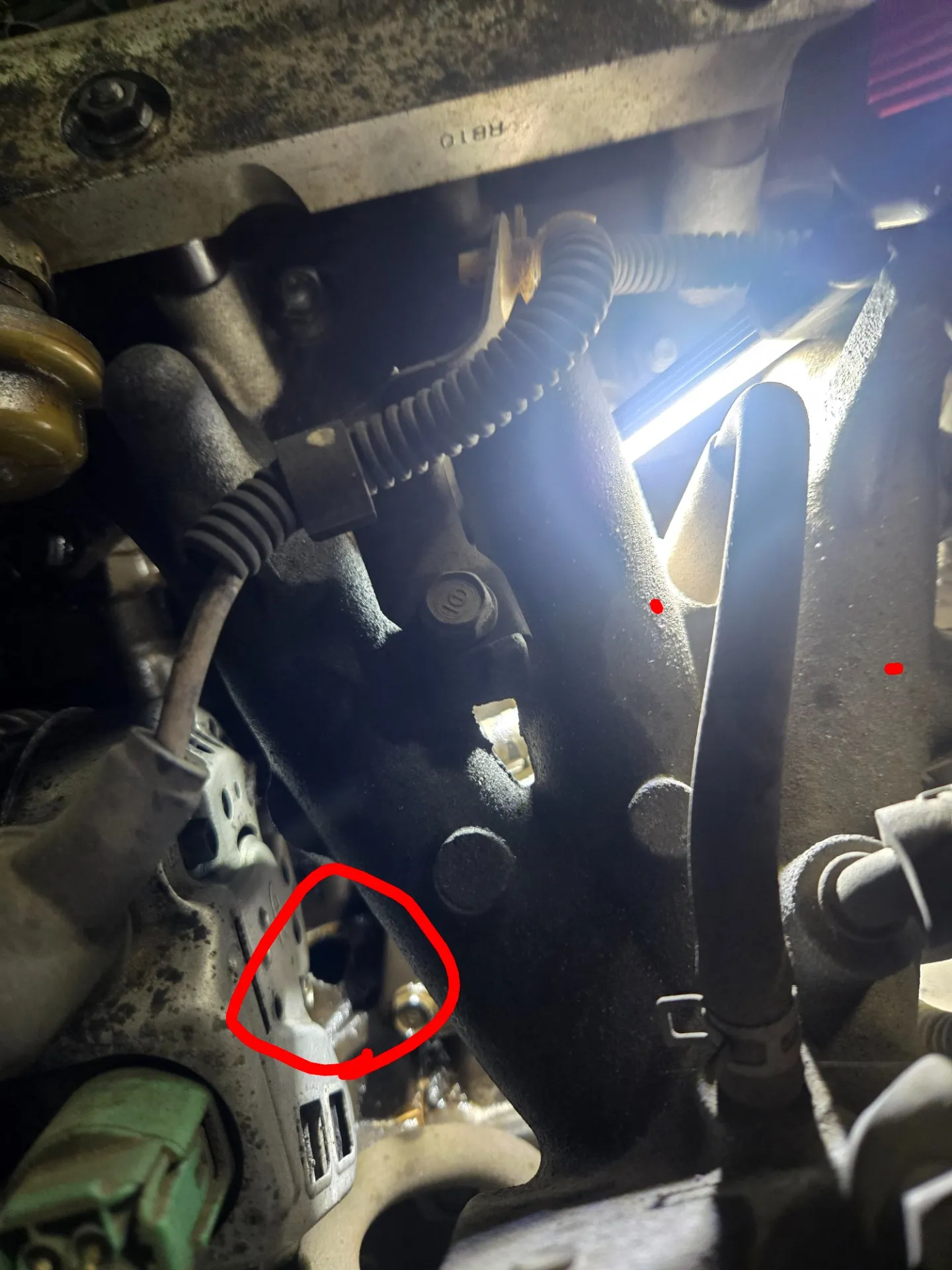 バモスのお車のご入庫、高速走行中エンジンが止まったとのこと、エンジンは掛かるがアクセル離すと止まるとのこと、オルタネーター下側のシリンダブロックに穴が開いており、二番と三番シリンダだけでエンジンがかかっていました。一番シリンダが破損しててもエンジンがかかっているのが、ふしぎでした。エンジン載せ換えを検討中とのことです。