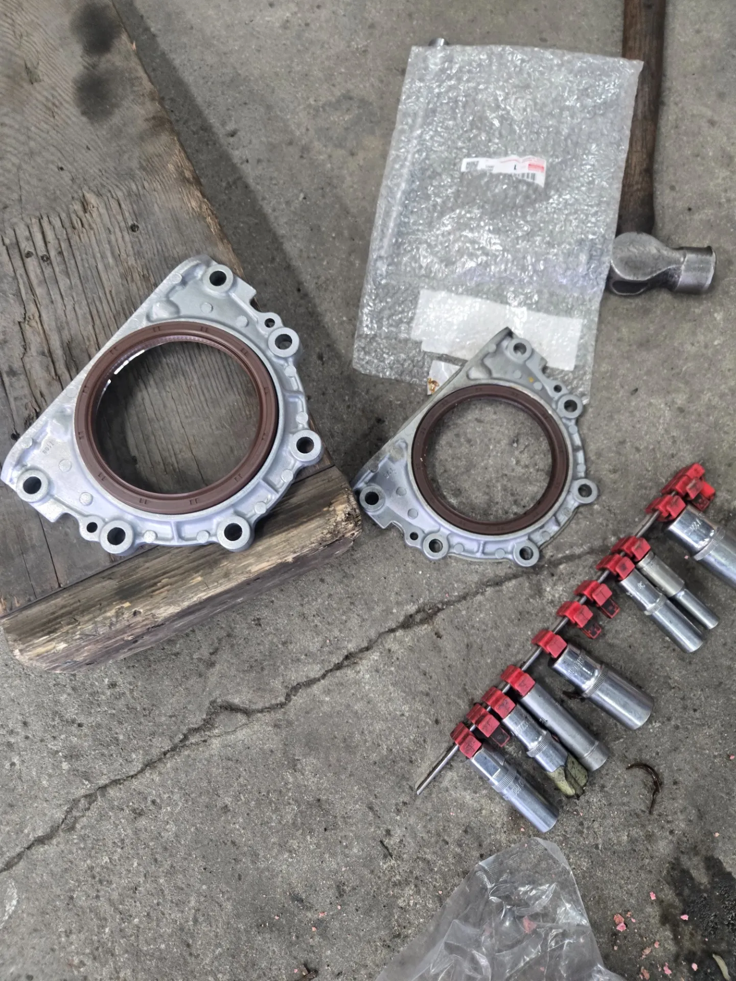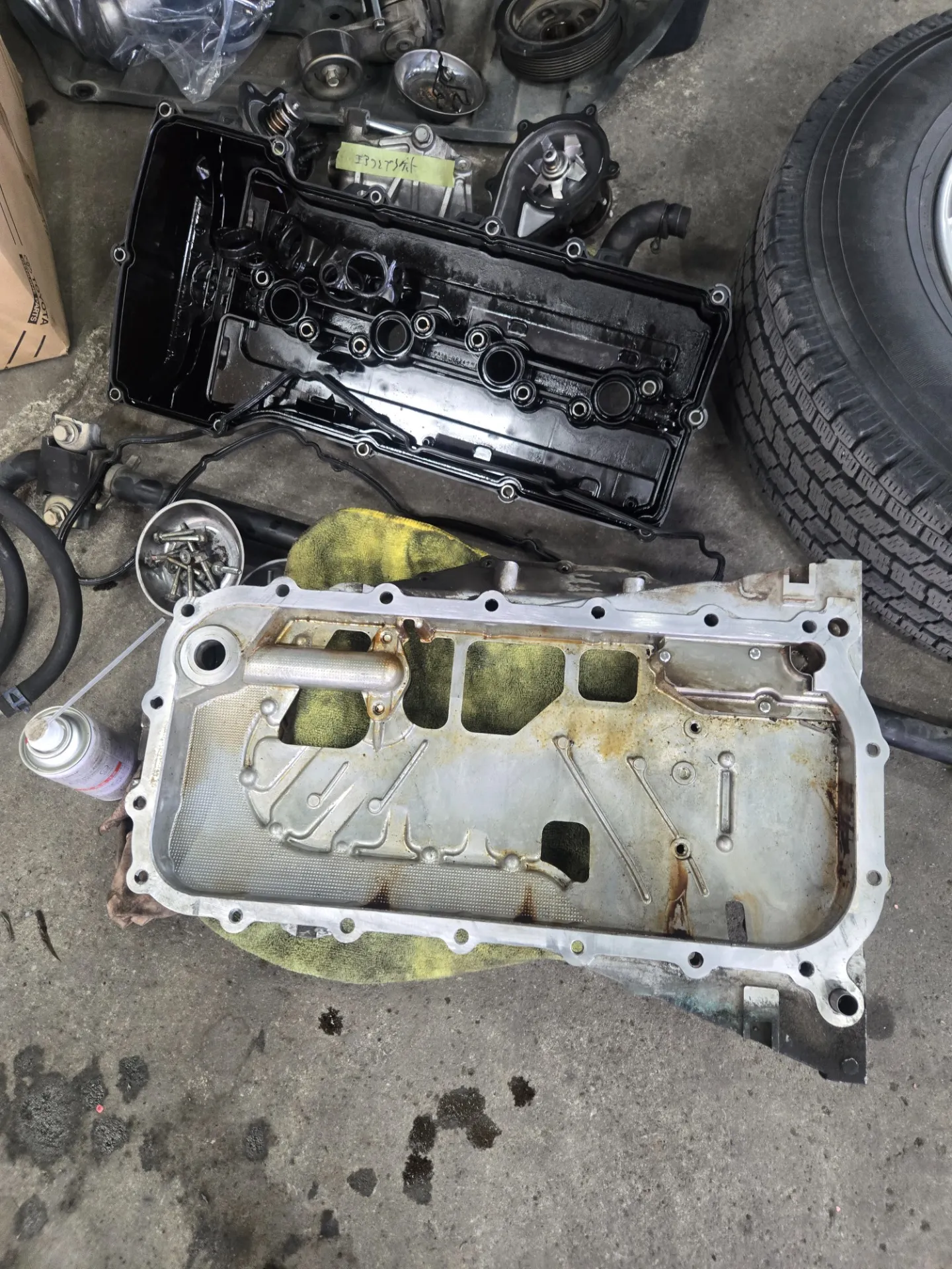 ハイエースオイル漏れ修理です。内容は、フロントチェーンカバー交換、クランクリヤオイルシール交換、エンジンマウント左右、ヘッドカバーassy交換、リヤライニング交換、タイミングチェーンカバーを交換するのに、エンジンオイルパンと、サブオイルパン、スペースがないのでギヤボックスごと脱着しないとてが入らずかなり大変です。しかもチェーンカバーが対策品になってるみたいでスタットボルトを外したり、クランクフロントオイルシールを交換して、オイルポンプ部をオイルを入れて馴染ませて取り付けて液体パッキンを塗り慎重に取り付けていきます。リヤオイルシール交換するためにオートマも脱着します。オイルパンはメインとサブもあるので丁寧に液体パッキンを塗り取り付けます。油圧のギヤボックスを取り付けパワステオイルを入れて、冷却水入れて、エンジンオイルをいれて、始動してエア抜きとオイル漏れを確認して充分に試運転したら完了です。
